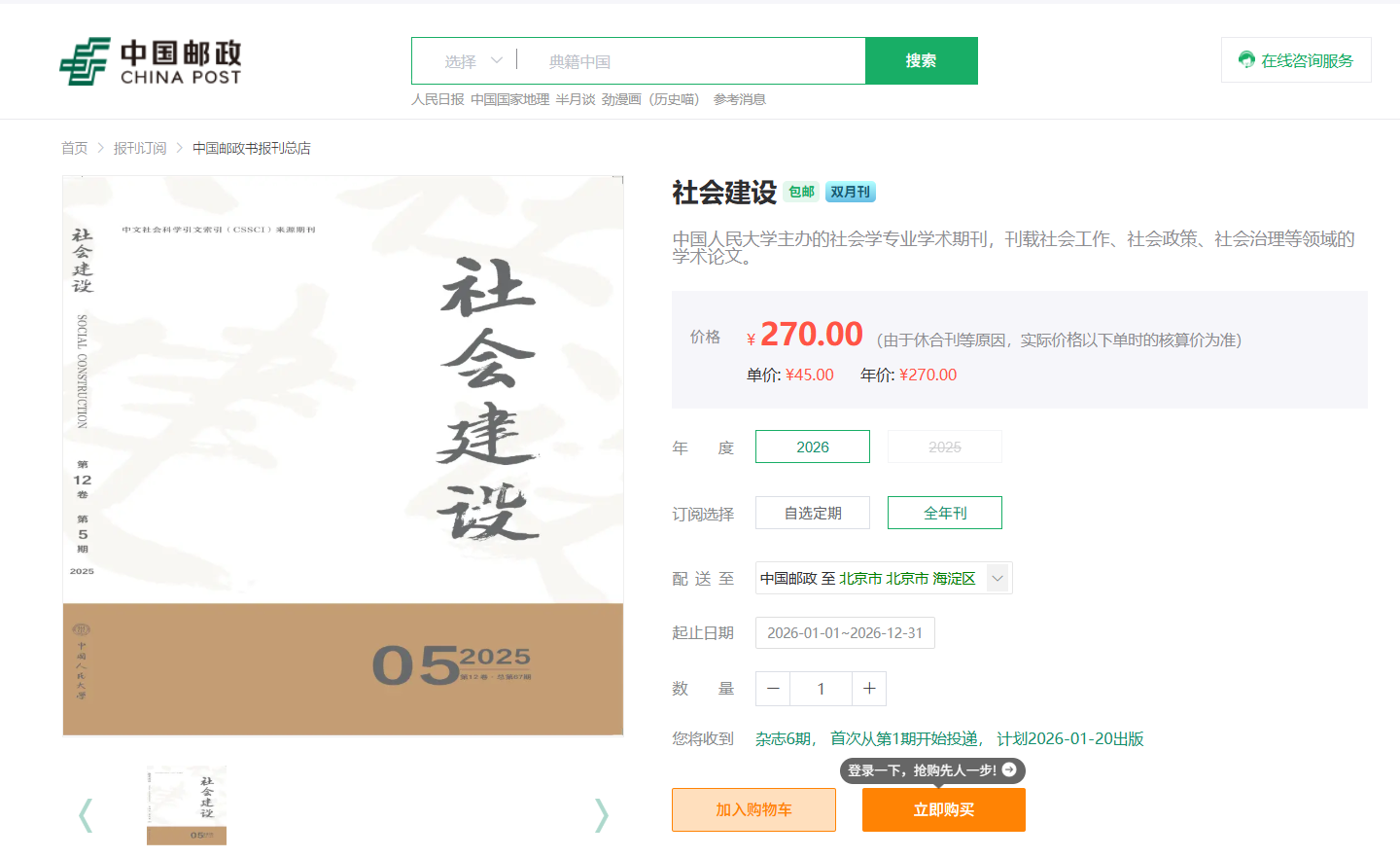 《社会建设》杂志2026年的征订工作现已正式开始。《社会建设》邮发代号80-874,双月刊240页,每期定价45元,全年合计270元。以下几种订阅方式可供选择: